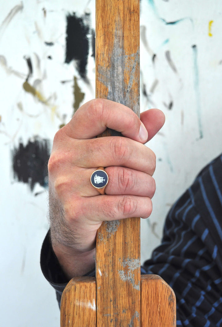 NAVY SAILBOAT VINTAGE CERAMIC CAMEO GOLD ROUND SIGNET RING